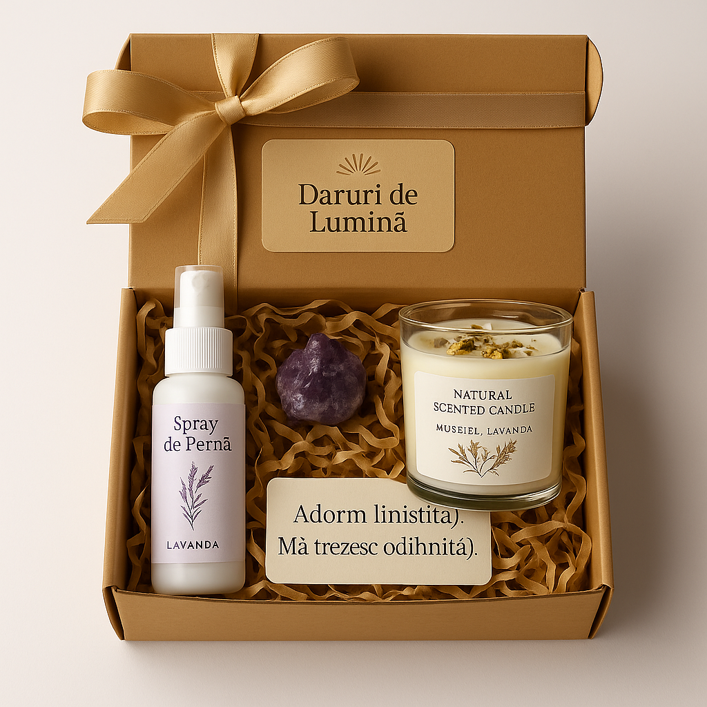 Cutie kraft cu fundă bej sau mov deschis, etichetă: Daruri de Lumină – Somn Liniștit