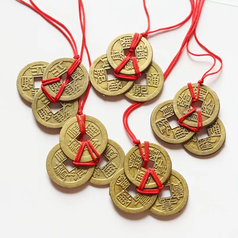 🔸 Set de 3 monede Feng Shui legate cu șnur roșu